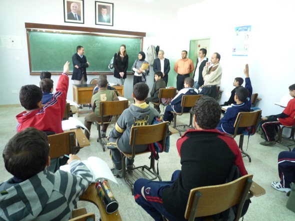 Members of the BDI team and staff from Jordan Visions (our local partner in Jordan), introducing themselves and answering questions in a school in Jordan.
